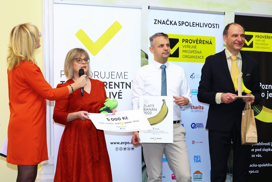 Asociace veřejně prospěšných organizací ČR (AVPO ČR) dnes odpoledne udělovala ocenění Zlatý banán, které získávají neziskové organizace za nejlepší příběh o konkrétní pomoci soukromého dárce na dobročinný účel. Bodovaly královehradecká organizace NOMIA, která provozuje psychologickou poradnu obětem domácího násilí, Aliance žen s rakovinou prsu a organizace EDA, která se věnuje rodinám dětí se zrakovým postižením.